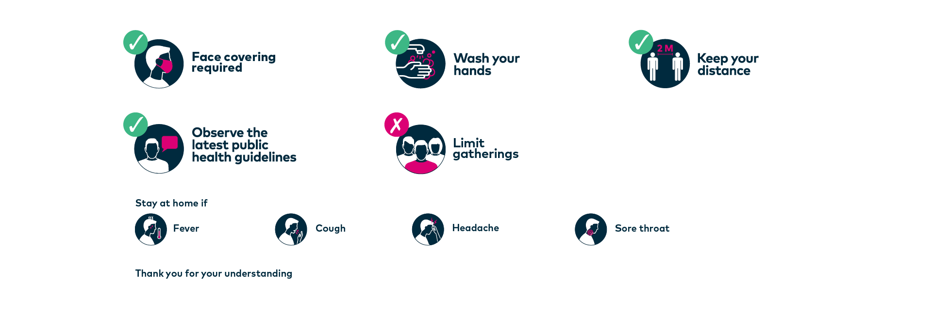 To ensure everyone’s safety, we continue to follow the rules and comply with government requirements. For this reason, everyone aged 10 years and over must wear a face covering when entering and circulating in the shopping centre.