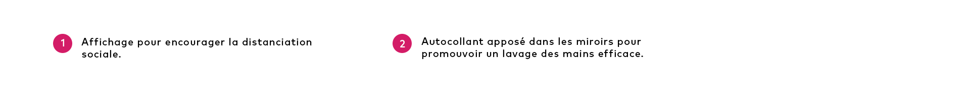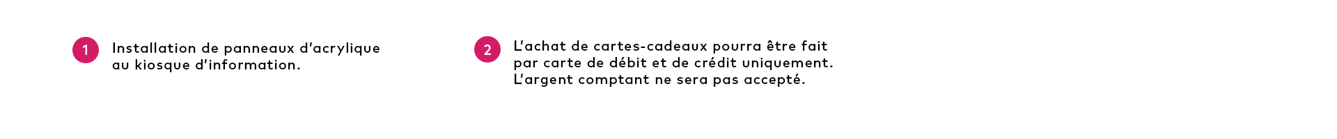 On a adapté nos aires communes afin d’offrir des lieux sécuritaires dans l’ensemble de notre centre commercial. Dans un souci de réduire les risques de propagation du virus et de limiter les rassemblements, on a mis en place de l’affichage clair permettant de guider vos déplacements dans l’établissement.