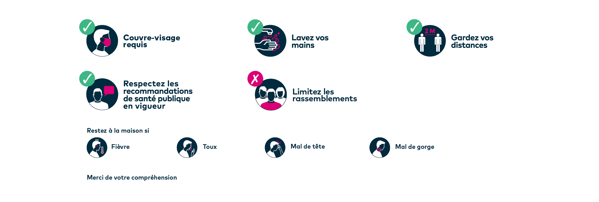 Afin d’assurer la sécurité de tout un chacun, on veille à suivre les consignes et à respecter les exigences gouvernementales en vigueur. C’est pourquoi le port couvre-visage est requis pour les personnes âgées de 10 ans et plus qui entrent et circulent dans le centre commercial.